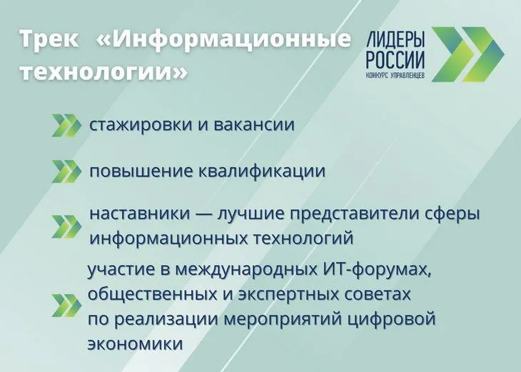 Цель https://disk.yandex.ru/d/tgWadEH54rISzw/Куратор%20трека%20IT%20Чернышенко.mp4?w=1">трека "Информационные технологии" ЛР – выявить специалистов с высоким потенциалом, способных создавать будущее с помощью цифровых технологий. Регистрация на этот трек стартовала 31 марта 2021 года в рамках медиапрезентации проекта. Презентация трека размещена по https://docviewer.yandex.ru/view/1130000020990404/?*=2bMez7ve5ekoVjBqndNPuL8kYA17InVybCI6InlhLWRpc2stcHVibGljOi8vaGw3bjV0cWpvS1o1LzJxTW5sOVhsY2QxZE1TNHhYSlFtcFRjdVI0ekJJallRREoyYnBzc2ZwSTRYNWNITUFvYXEvSjZicG1SeU9Kb25UM1ZvWG5EYWc9PSIsInRpdGxlIjoi0JvQoF%2FQmNCiLnBkZiIsIm5vaWZyYW1lIjpmYWxzZSwidWlkIjoiMTEzMDAwMDAyMDk5MDQwNCIsInRzIjoxNjE4NTYyNjg3NjExLCJ5dSI6IjI1OTkzNDMzMTE1OTkyMzYyMDEifQ%3D%3D">ссылке. Запуск трека поддержал заместитель Председателя Правительства Российской Федерации и куратор трека «Информационные технологии» Дмитрий Чернышенко.